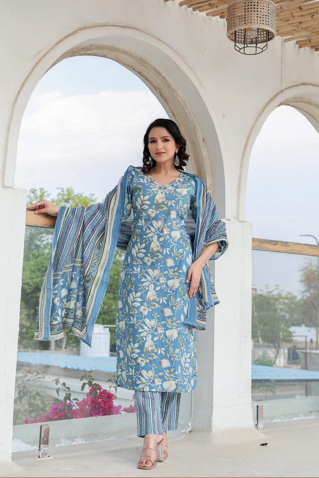 Blue Floral Printed Cotton Suit Set with Dupatta