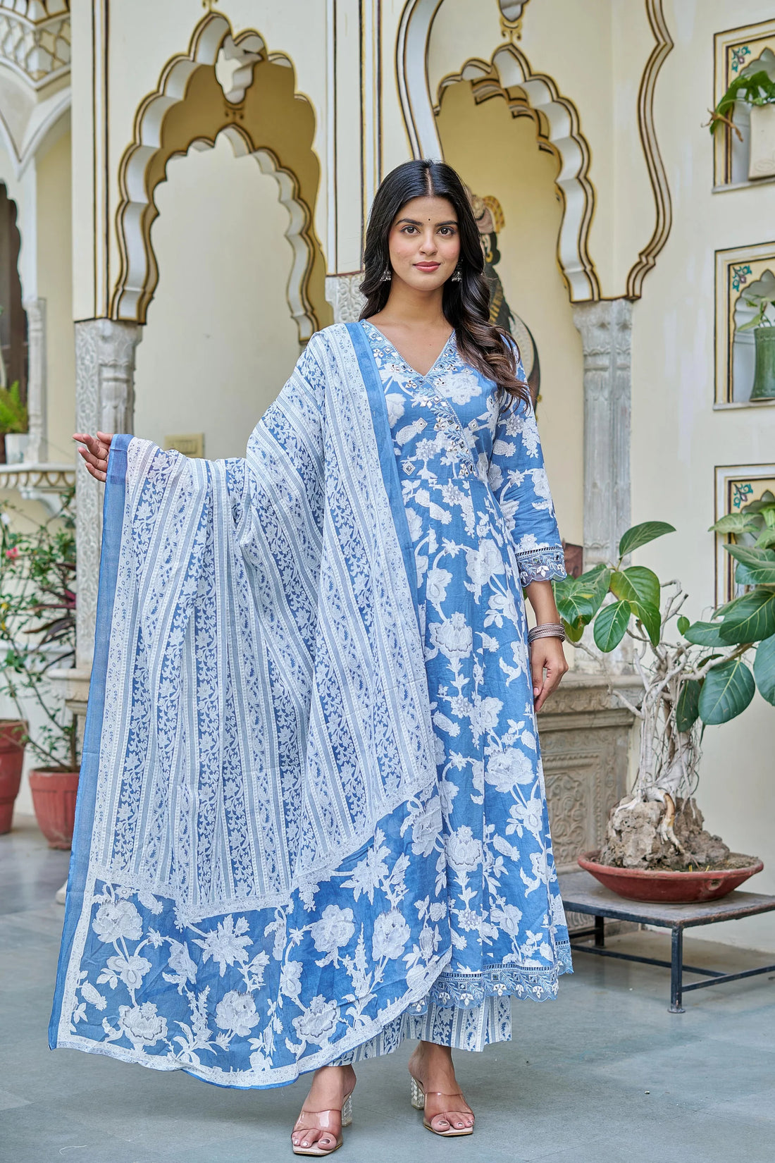 Blue & White Floral Anarkali Cotton Suit Set with Dupatta